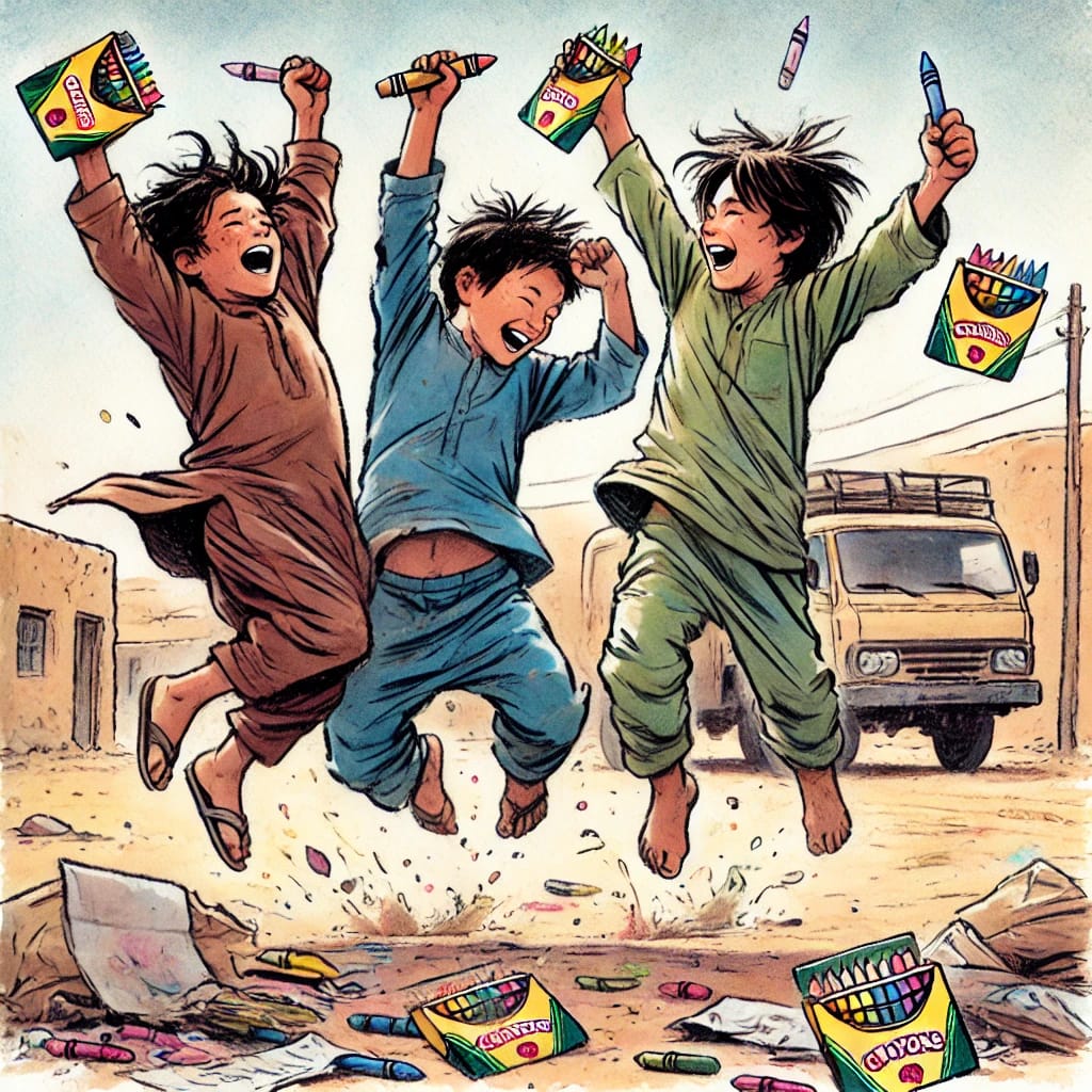 Ich bat Rico, anzuhalten. Als ich die Tür öffnete und die Jungs heranwinkte, kamen zwei von ihnen näher. Ich drückte ihnen drei Packungen Buntstifte in die Hand – für jeden eine. 🖊🖊🖊