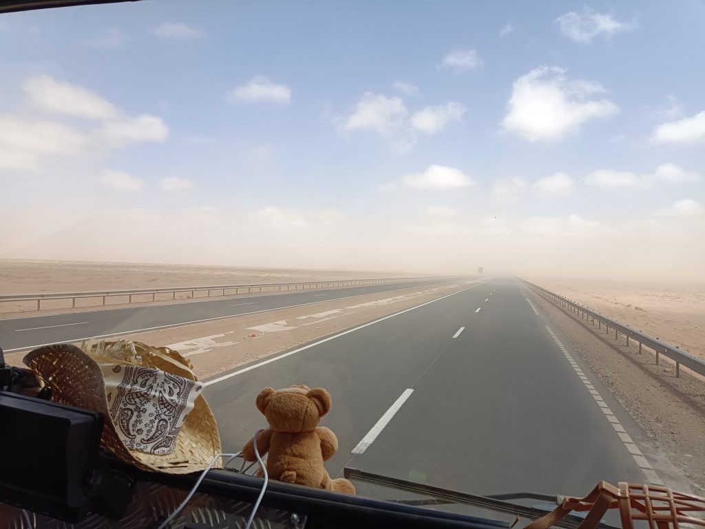 Die letzten Tage waren sehr windig. Oft sahen wir von weitem rosa Staubglocken am Horizont – das war der Saharasand in der Luft. Manchmal waren wir mittendrin, und die Sicht wurde durch den feinen Sand stark eingeschränkt. Der Sand kriecht wirklich in jede Ritze, und Rico reinigt alle paar Tage Charlys Luftfilter, damit unser treuer Begleiter nicht erstickt.