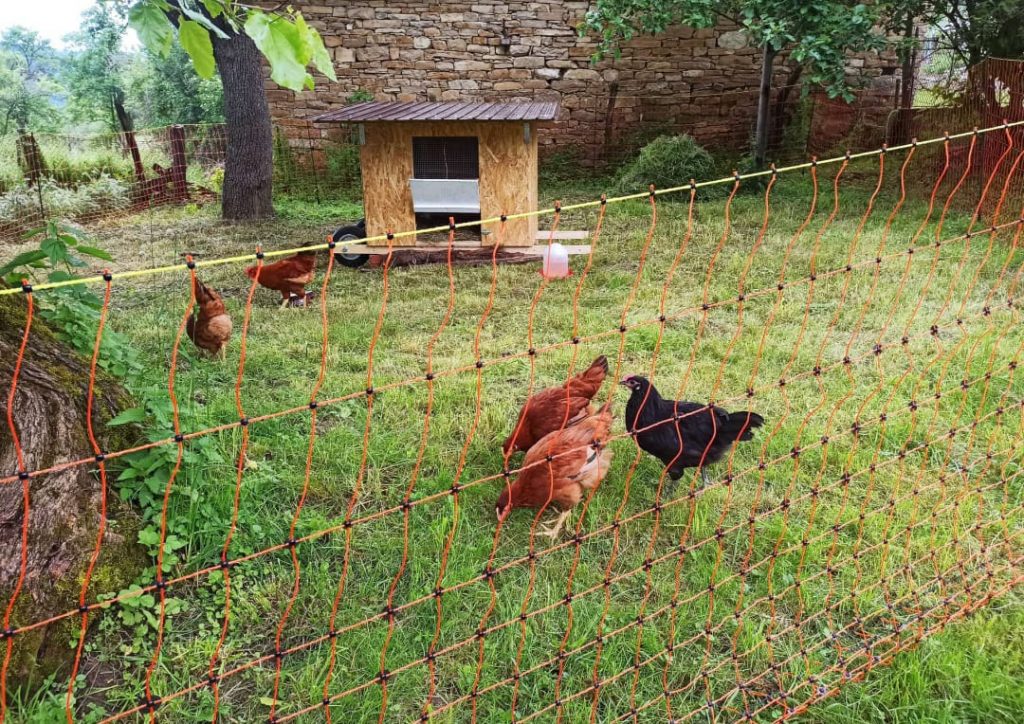 Und dann sind da noch… unsere Hühner. Stundenlang könnten wir ihnen zusehen. Wirklich – Fernsehen war gestern. Jedes Huhn ist anders, hat eine eigene Art, ein eigenes Temperament. Sie picken, sie scharren, sie unterhalten uns. Die ersten Tage hatten sie nur ein kleines, provisorisches Gehege. Doch seit wenigen Tagen haben sie einen riesigen Auslauf – mit Strom, damit Marder, Füchse und andere pelzige Gangster draußen bleiben.