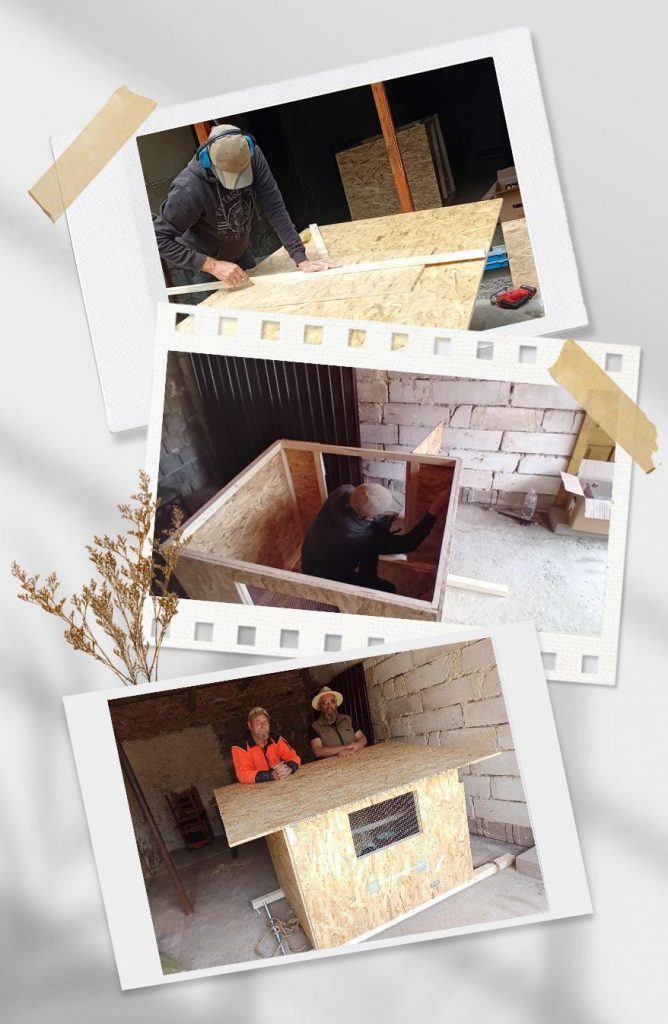 Unsere Hühner durften erstmal zur Untermiete bei Steffen und Anja wohnen, im Nebengebäude. Aber natürlich sollten sie ihr eigenes, tolles Hühnerheim bekommen. Also machten sich Rico, Steffen und Uli an den Stallbau – mit Know-how, Holz, Schweiß und Abschlussbier.