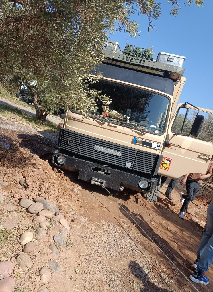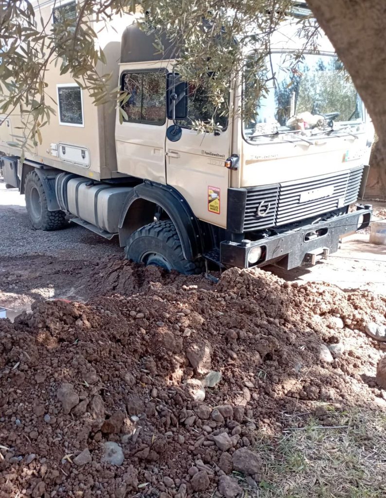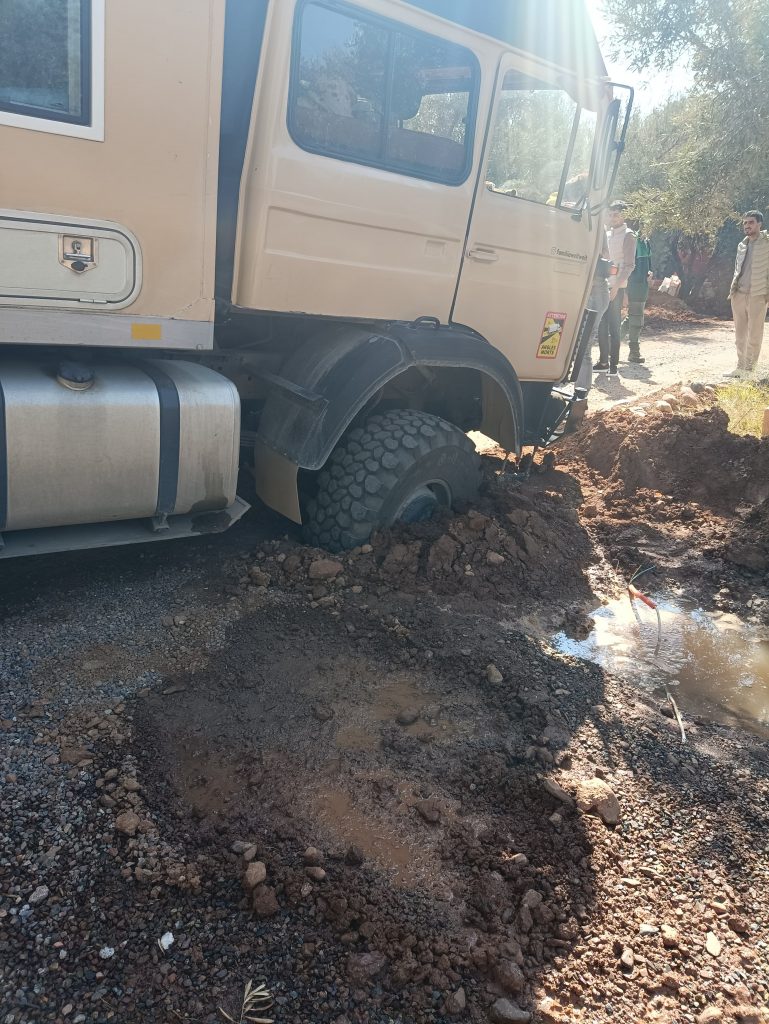Bereits bei unserer Ankunft am Donnerstag bauten Arbeiten an einem tief ausgeschachteten Graben direkt neben dem Fahrweg. Wahrscheinlich sollte hier ein neues Abwassersystem entstehen und Rohre verlegt werden. Aufgrund des Regens zwei Tage zuvor und wohl zusätzlich eines Wasserschadens stand der komplette Graben unter Wasser. Der Weg war sehr schmal und extrem schlammig und wir waren etwas skeptisch, ob wir uns dort vorbeikommen. Die Männer des Platzes waren da zuversichtlicher… Doch wir sollten Recht behalten 🥴 Soll heißen: wir steckten mit unseren Vorderreifen wunderbar und tief im Schlamm.
