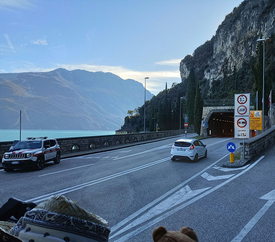 So sperrten die beiden Ordnungshüter kurzzeitig die Straße und wir drehten um (glücklicherweise war die Straße an dieser Stelle breit genug). Bei wunderschönem Sonnenschein fuhren wir also durch die typischen Urlauberorte. Wart ihr schonmal am Gardasee?
