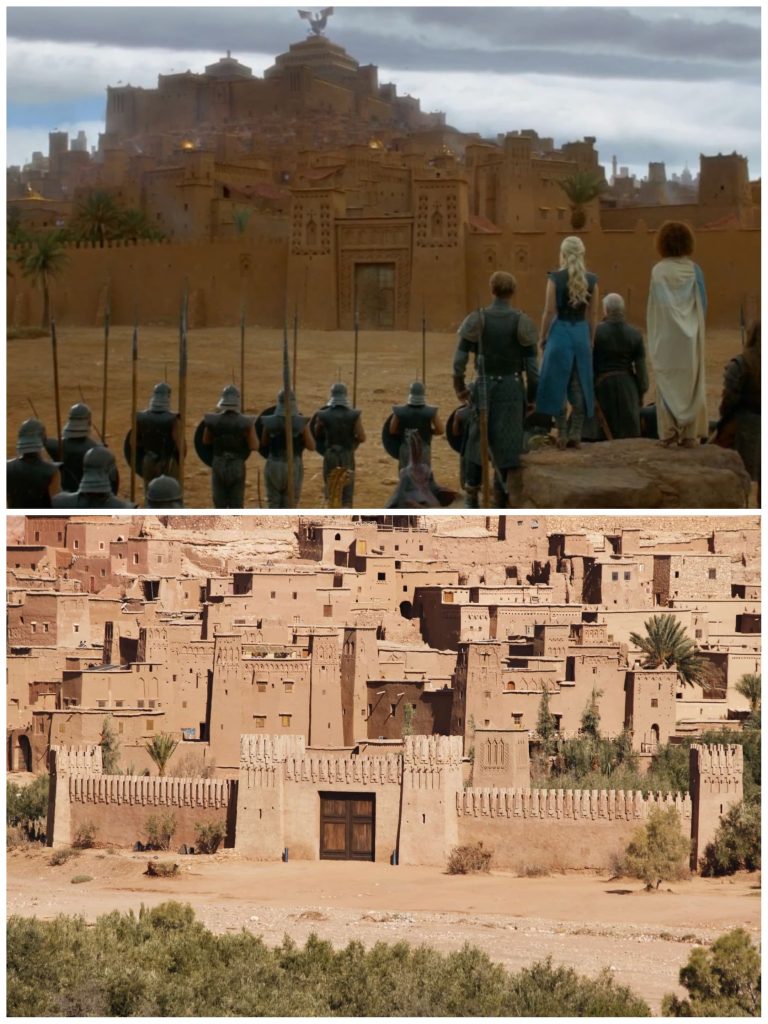 Ein weiterer Sightseeing-Punkt waren eigentlich die „Atlas-Studios“. Die Atlas Filmstudios in Ouarzazate sind als Kulisse zahlreicher Hollywood-Blockbuster bekannt, darunter Gladiator, Die Mumie und Game of Thrones. Ursprünglich hatten wir vor, die Studios zu besichtigen, haben uns aber kurzfristig dagegen entschieden. Nach einigen Recherchen lasen wir immer wieder, dass viele der alten Filmkulissen mittlerweile stark verwittert und nicht mehr in bestem Zustand sind. Zudem soll die Ausstellung eher klein ausfallen, und das gesamte Erlebnis wirkt sehr auf den Massentourismus ausgerichtet. Der nächste Punkt war für mich als Fan von Game of Thrones allerdings wichtig: Aït-Ben-Haddou. die berühmte Lehmsiedlung und UNESCO-Weltkulturerbe, ist zweifellos ein beeindruckendes Fotomotiv. Die Kulisse, die schon in zahlreichen Filmen und Serien wie Gladiator oder eben Game of Thrones zu sehen war, thront malerisch in der kargen Landschaft. Wir haben uns jedoch auch hier entschieden, den Ort nur von entfernten Aussichtspunkten zu betrachten. Immer wieder haben wir gelesen, dass es innerhalb der Kasbah sehr touristisch zugeht, mit zahlreichen Souvenirständen und hohem Besucherandrang. Stattdessen genossen wir den Blick auf das historische Bauwerk aus der Ferne. In Game of Thrones ist die beeindruckende Lehmsiedlung als Teil von Yunkai zu sehen, einer der Sklavenstädte von Essos. Besonders markant ist die Szene, in der Daenerys Targaryen mit ihrer Armee vor den Toren der Stadt steht und die Befreiung der Sklaven vorbereitet. Wer nun diese Szenen kenn und vor der Realität steht, ist sicher etwas verwirrt. Zwar ist Aït-Ben-Haddou angesichts seiner traditionellen Bauwese beeindruckend, entspricht aber nicht der Größe und dem Umfang der im Film dargestellten Stadt Yunkai.