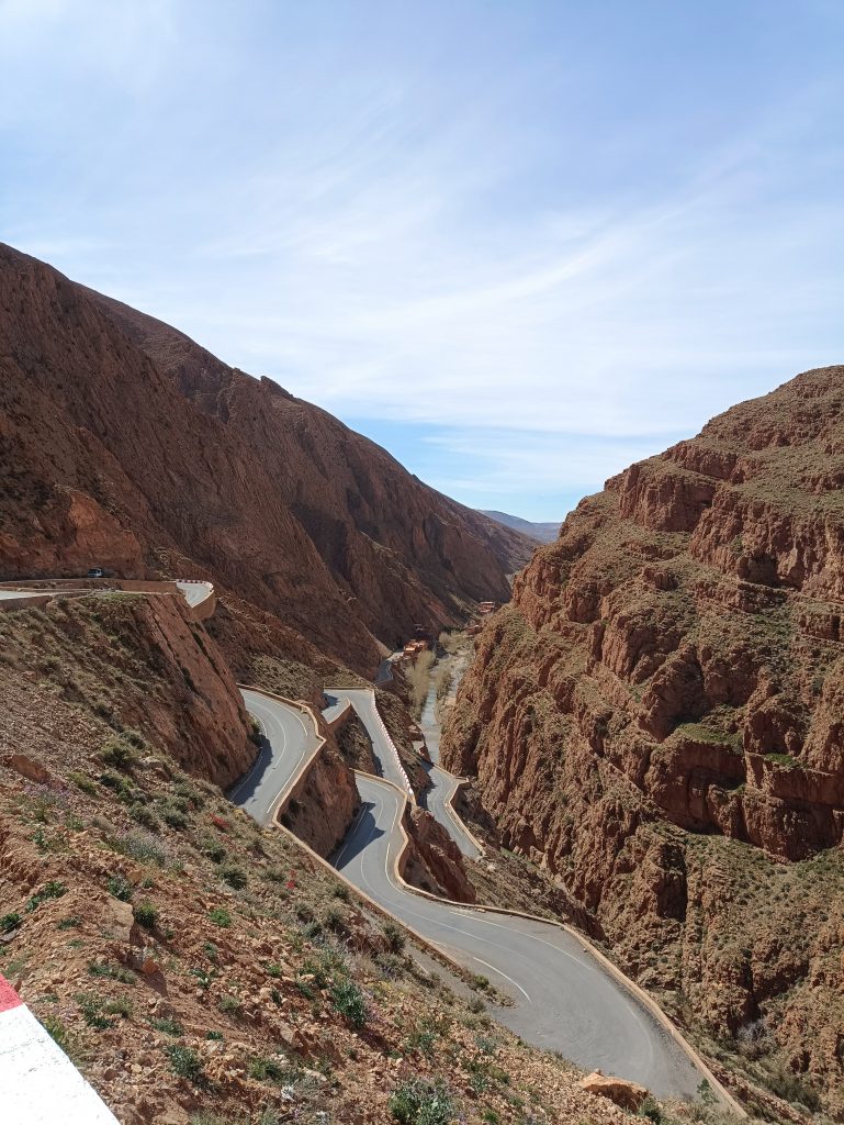 Weitere Punkte auf unserer Marokko-Liste waren zum einen die Tordga-Schlucht und zum anderen die Dades-Schlucht bzw das Tal Dades. Bei diesen Sachen ging es hauptsächlich um die tolle Fahrstrecke. Möchte man beide Schluchten an einem Tag durchfahren, beträgt die Strecke rund 200 km. Ist man durch eine Schlucht durch, geht es hoch hinauf bis auf 2.900 hm und dann natürlich wieder hinunter. Die Ausblicke und wechselnden Landschaften waren grandios. Anfangs fuhren wir durch eine Oasenstadt mit unzähligen Palmen, welche direkt in Tordgha-Schlucht mündete. Die Felswände links und rechts waren gigantisch. So sehr wir uns im Charly verrenkten- wir konnten bei der Durchfahrt kaum den Himmel über den Felsen sehen.