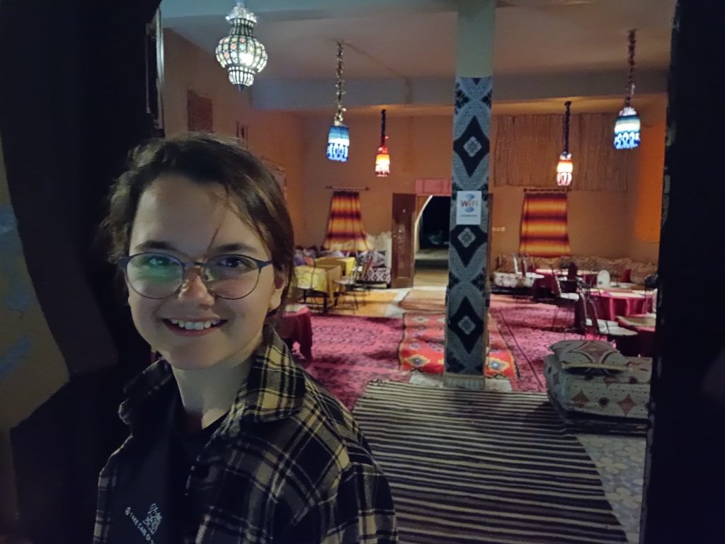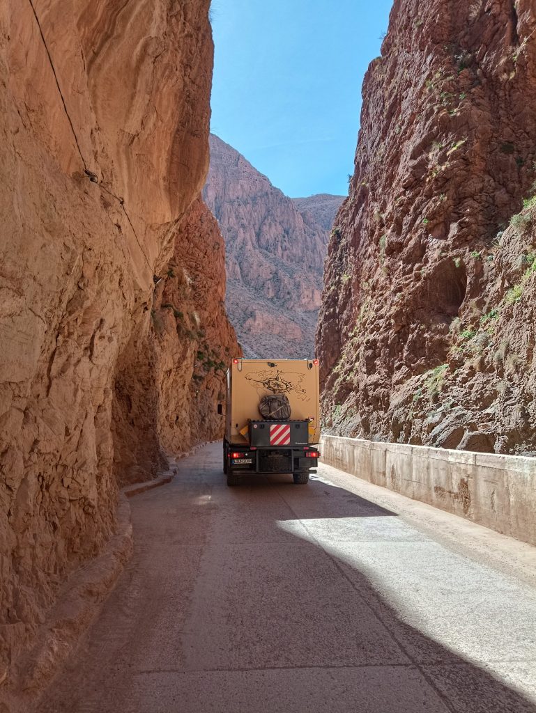 Wir fanden einen Campingplatz genau am Eingang der Schlucht. An dieser Stelle möchte ich auf die Frage eingehen, die mich die letzten Tage mehrfach erreichte. Wie sieht es in Marokko mit Freistehen aus? Gesetzlich wäre es kein Problem, in Marokko ist freies Campen erlaubt. Doch wir ziehen so viel Aufmerksamkeit auf uns und auch aufgrund der oben erläuterten Kinder-Thematik fühlen wir uns auf Campingplätzen wohler. Es ist für uns keine Frage der Sicherheit. Unsicher würden wir uns beim Freistehen auch hier fühlen – aber wir haben keine Muse die ganze Zeit von Neugierigen umringt zu werden 😅 Die Preise der Campingplätze sind hier so günstig, dass wir das gern in Anspruch nehmen. Bisher haben wir zwischen 5 und 10 € pro Nacht gezahlt. Der teuerste Platz lag bei 12€ pro Nacht. Wie ich anfangs erwähnte sind wir derzeit auf einem sehr luxuriös anmutenden Platz. Alles ist wunderbar gepflegt, es gibt einen großen Pool mit Liegen (Nutzung inkl.), eine Bar und Restaurant. Abends erstrahlt alles in in wunderschönen Lichterketten und anderen dekorativen Strahlern. Jeden Morgen gibt ein marokkanisches Baguette inklusive. Mega freundliches Personal. Und das wirklich für 10€. Heute fragte Rico nach einem zweiten Baguette – auch das gab´s kostenlos. Lucy hat sich zum Geburtstag einen Bananenkuchen gewünscht. Das Problem: Wir haben keine Bananen 🙈 Ich fragte im Restaurant und der Angestellte kam freudestrahlend mit EINER Banane zurück. Die Einzige. 😂 Auch für die wollte er kein Geld.