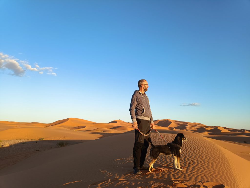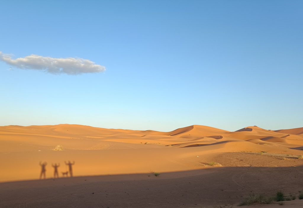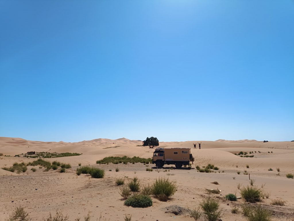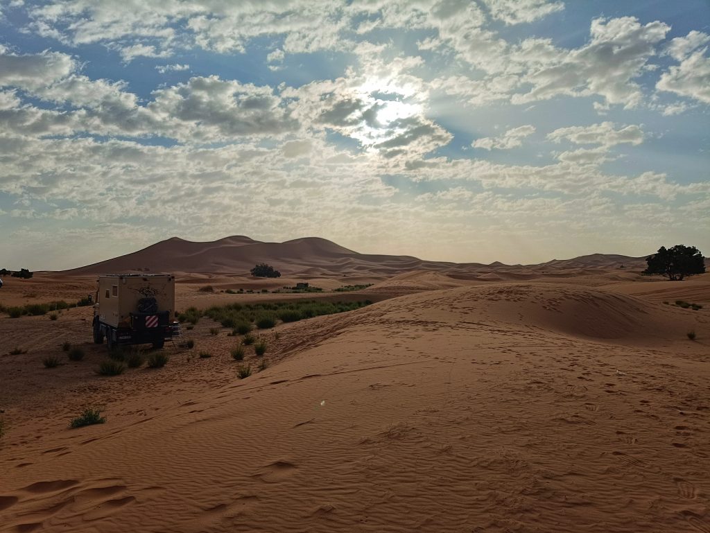 In Merzouga bietet ein Hotel Campern preisgünstig die Möglichkeit, unmittelbar an dem Rand der Düne zu stehen . Aufgrund unseres Fahrzeugs und unserer Unabhängigkeit vom Strom bot uns der Hotelbesitzer einen besonderen Platz an, den die normalen Wohnmobile nicht erreichen konnten. Mustafa erklärte, das Gäste mit solchen Expeditionsmobilen gern „dort unten“ stehen würden. Wir fuhren einen kleinen erdigen Hügel hinunter – es war ein absolut perfekter Platz. Etwas weg von der Masse, die Füße beim Verlassen unseres Zuhauses direkt im Sand und mit herrlichen Blick auf Erg Chebbi. 🥰