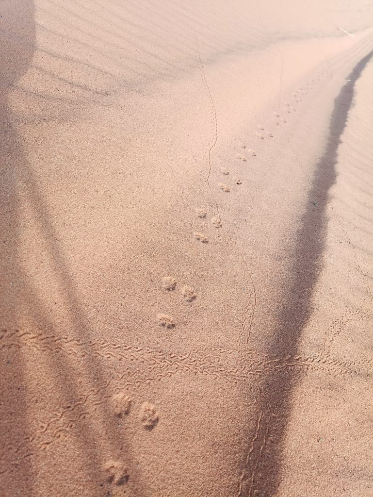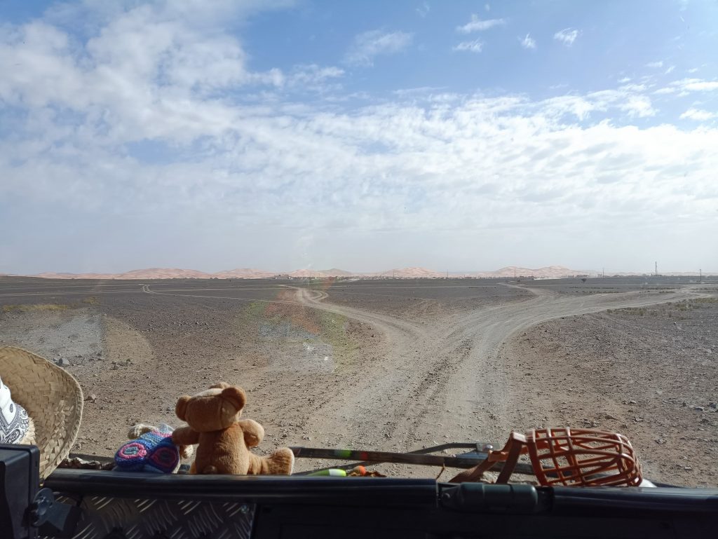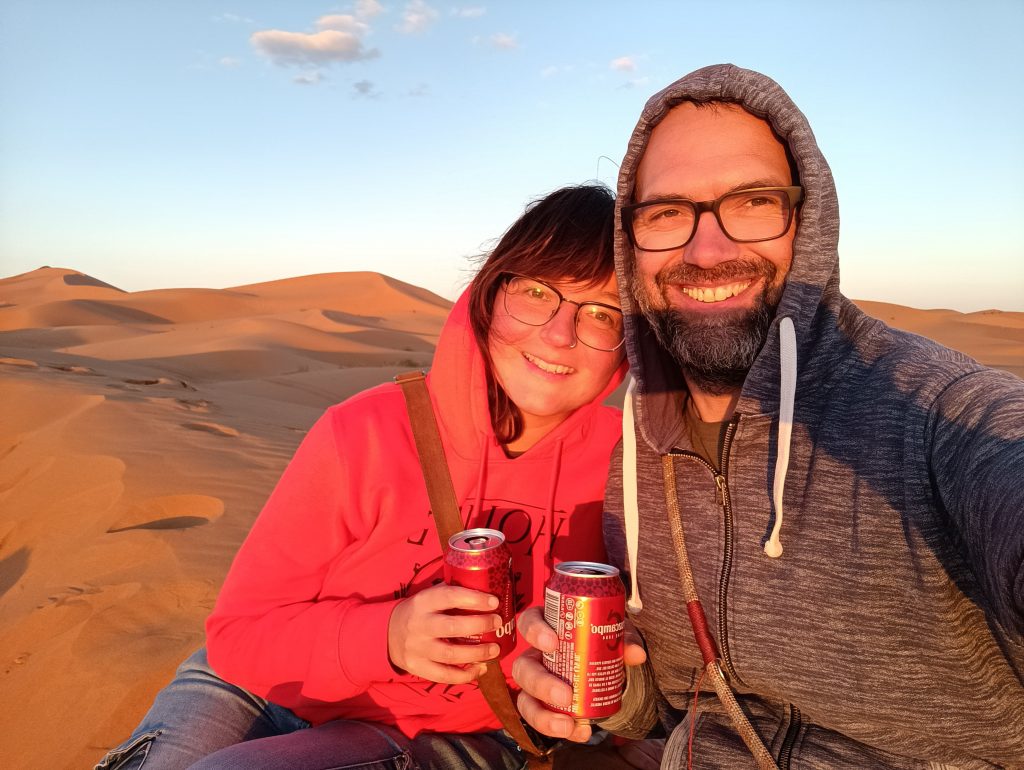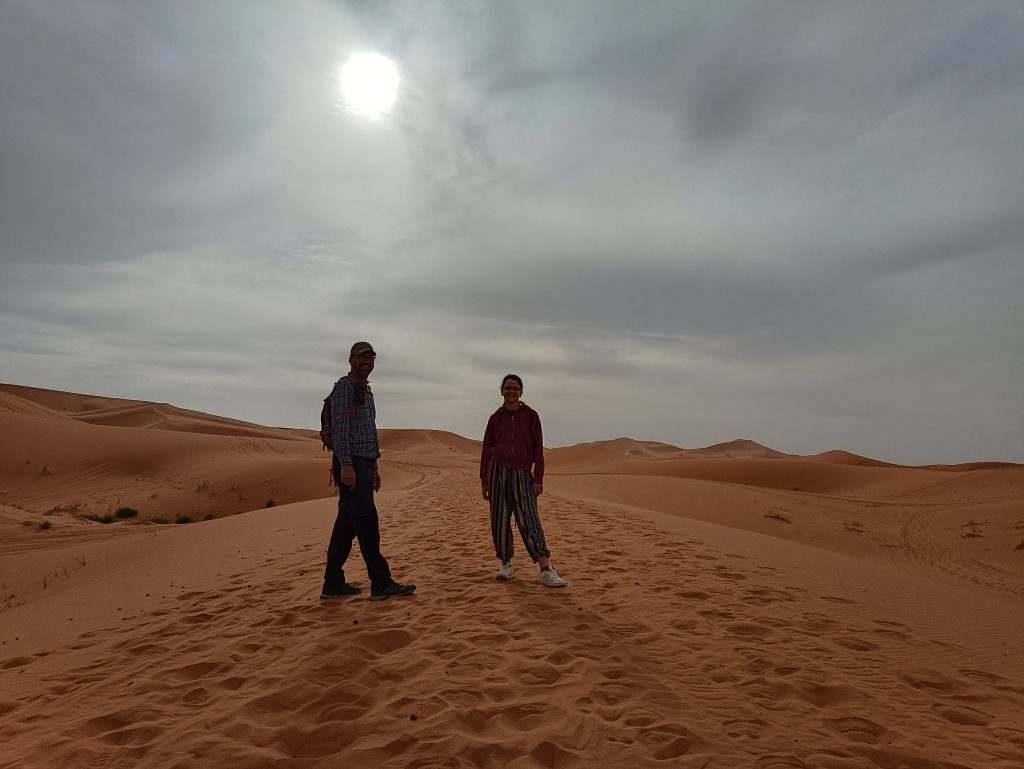 In Merzouga bietet ein Hotel Campern preisgünstig die Möglichkeit, unmittelbar an dem Rand der Düne zu stehen . Aufgrund unseres Fahrzeugs und unserer Unabhängigkeit vom Strom bot uns der Hotelbesitzer einen besonderen Platz an, den die normalen Wohnmobile nicht erreichen konnten. Mustafa erklärte, das Gäste mit solchen Expeditionsmobilen gern „dort unten“ stehen würden. Wir fuhren einen kleinen erdigen Hügel hinunter – es war ein absolut perfekter Platz. Etwas weg von der Masse, die Füße beim Verlassen unseres Zuhauses direkt im Sand und mit herrlichen Blick auf Erg Chebbi. 🥰