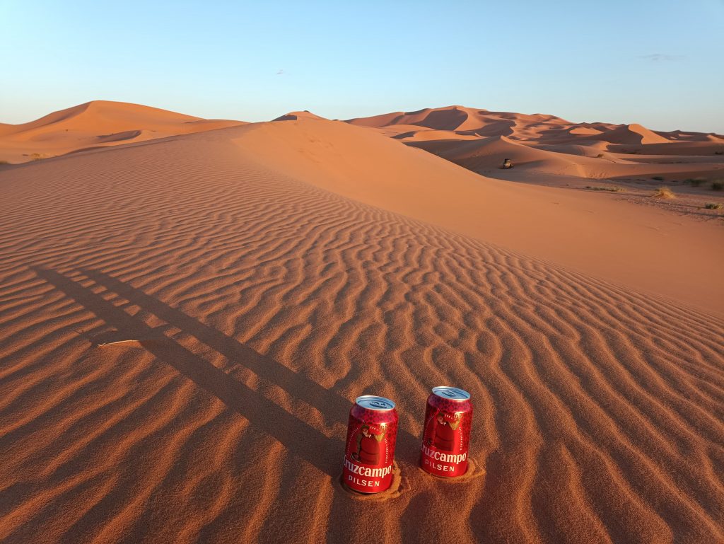 In nahezu jedem kleinen Dorf findet man einen Tante-Emma-Laden – oder, hier dann wohl besser einen „Onkel-Ahmet-Laden“😉 Diese Shops bieten Waren aus allen möglichen Kategorien an. Frisches Obst, Gemüse, Gewürze und vieles mehr erhält man auch an Straßenständen. Wer Fleisch essen möchte, wird auch fündig – Schweinefleisch gibt es jedoch keines, da Muslime dies bekanntlich nicht verzehren. An unzähligen Geschäften sahen wir bereits halbe oder ganze abgezogene Kühe und Schafe, oder man konnte sich ein Huhn frisch schlachten lassen. Alkoholische Getränke gäbe es in Marokko auch, allerdings zu sehr hohen Preisen. Wir hatten einige Flaschen Rotwein aus Italien und Bier aus Spanien für die gesamte Afrikareise auf Vorrat gelegt. Wie wir nun festgestellt haben, ist im nachfolgenden Land Mauretanien Alkoholkonsum strengstens verboten. Auch eine Einfuhr wird nicht geduldet, sondern mit Geldstrafen (oder gar Haftstrafen) versehen. Das heißt, wir trinken nun jeden Tag, damit wir keine alkoholischen Getränke über die Grenze nehmen 🤪 (keine Sorge, es ist dennoch alles im Rahmen und mit gutem Gewissen vertretbar 😂)