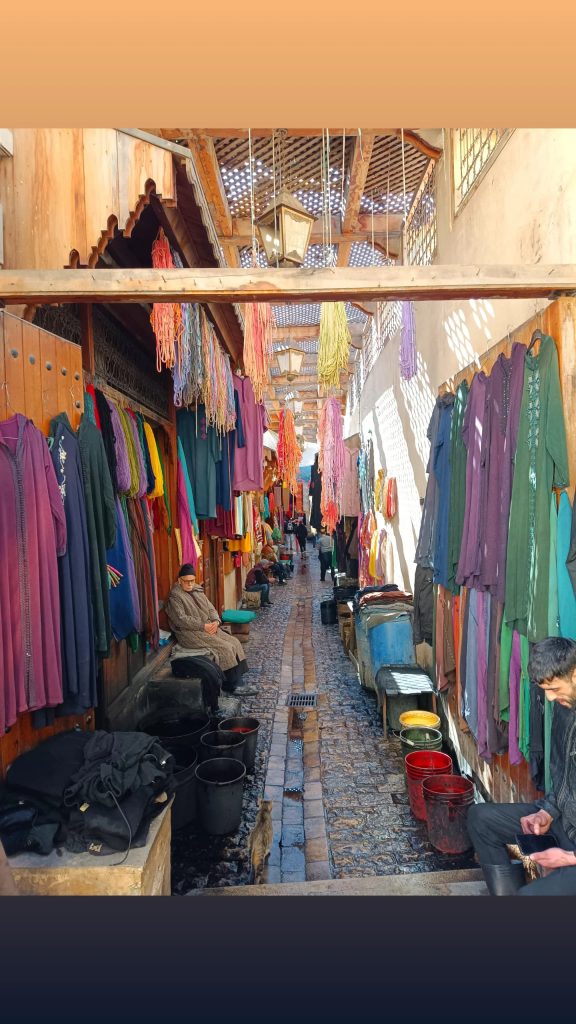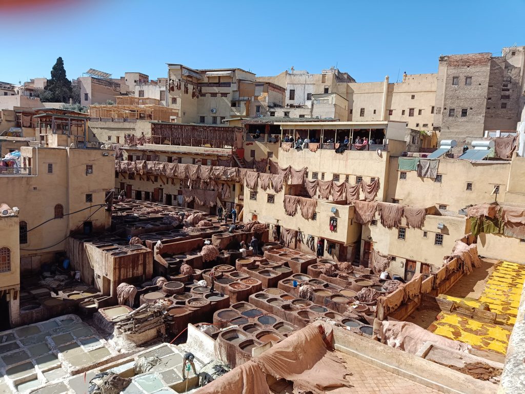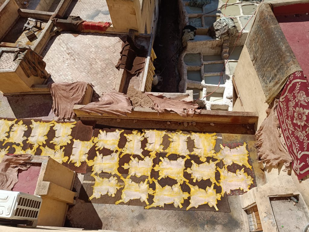 Unser Taxi kam und fuhr Rico und mich in die Medina von Fès. Ein älteres, englisches Pärchen saß ebenfalls mit im Auto und dank der angeregten Unterhaltung mit den beiden verlief die Hinfahrt sehr kurzweilig. Der Taxifahrer setzte uns am Gerberei-Viertel ab. Fès ist sehr bekannt für sein Lederhandwerk. Wir hatten einen Blick von oben auf die Gerber-Becken. Entlang der Mauer rund um das Viertel hingen Tierhäute und Felle. Der Geruch war unbeschreiblich. 🤢 Es stank unglaublich, dass wir es gar nicht lange aushielten.