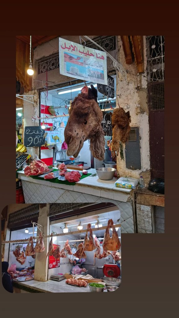 Wir entdeckten zahlreiche Handwerke: Männer, die aus Hörnern nicht nur Kelche, sondern auch Kämme oder Schmuck herstellten, Verarbeitung von Metallen zu Armbändern, Ohrringen aber auch Teeservicen und kunstvollen Spiegeln. Überall konnte man süßes Gebäck kaufen (natürlich gönnten wir uns etwas), aber auch Unmengen Obst und Gemüse. Interessant (und zugleich schockierend) war der Stand, welcher Kamelfleisch anbot. Denn hier hingen 2 Köpfe der Höckertiere 🙈 Noch ein Stück weiter fanden wir einen Fleischstand, bei welchem wir eine Weile überlegten, von welchem Tier das angebotene Teil stammt. Hinterteile mit Schwänzen… wahrscheinlich Ziege oder Schaf?!