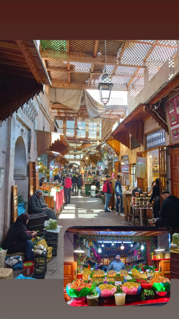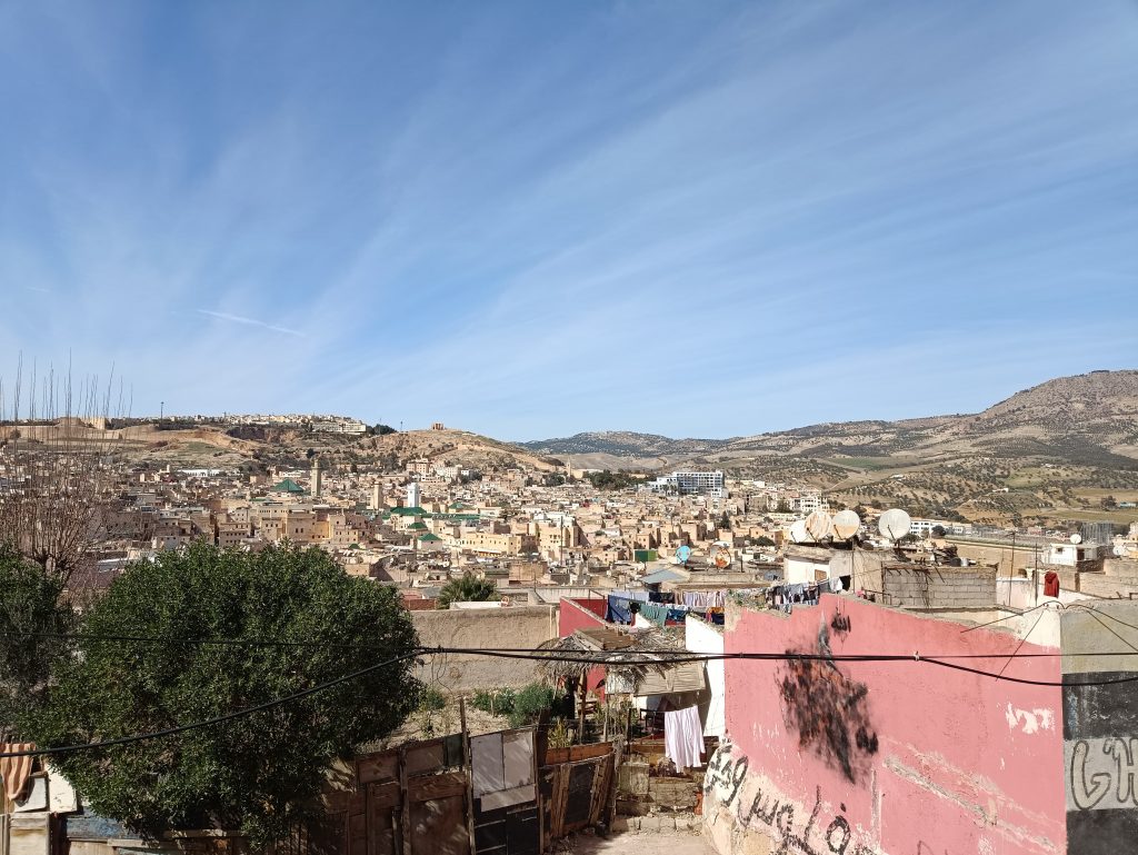 Zwischen all den optischen Eindrücken und den wechselnden Gerüchen – von Gewürzen, über Knoblauch bis hin zu unerwarteten Nuancen – wurde es in den engen Gassen zu intensiv. Nach einiger Zeit war es echt anstrengend und wir mussten raus aus dem Getümmel. Wir fanden uns nach kurzer Zeit auf Wegen wieder. Hier liefen wir lediglich ein paar Einheimischen über den Weg. Als wir so dahin schlenderten, sprach uns ein Jugendlicher an. Es ergab sich, dass er uns plötzlich durch die Gassen führte uns uns dies und das über das Leben in Marokko und Wissenswertes zur Stadt erzählte. Mohammed hatte ein ganz schönes Tempo drauf und das bei steilen Anstiegen. Es ging rauf und runter. Unser Guide zeigt uns die Medina, in der sonst nur die Einheimischen einkaufen gehen. Leider waren die Läden zu dieser Zeit geschlossen – es war Mittagspause und anschließend Gebetszeit. Er zeigte uns einen Blick über die gesamte Altstadt von Fès.