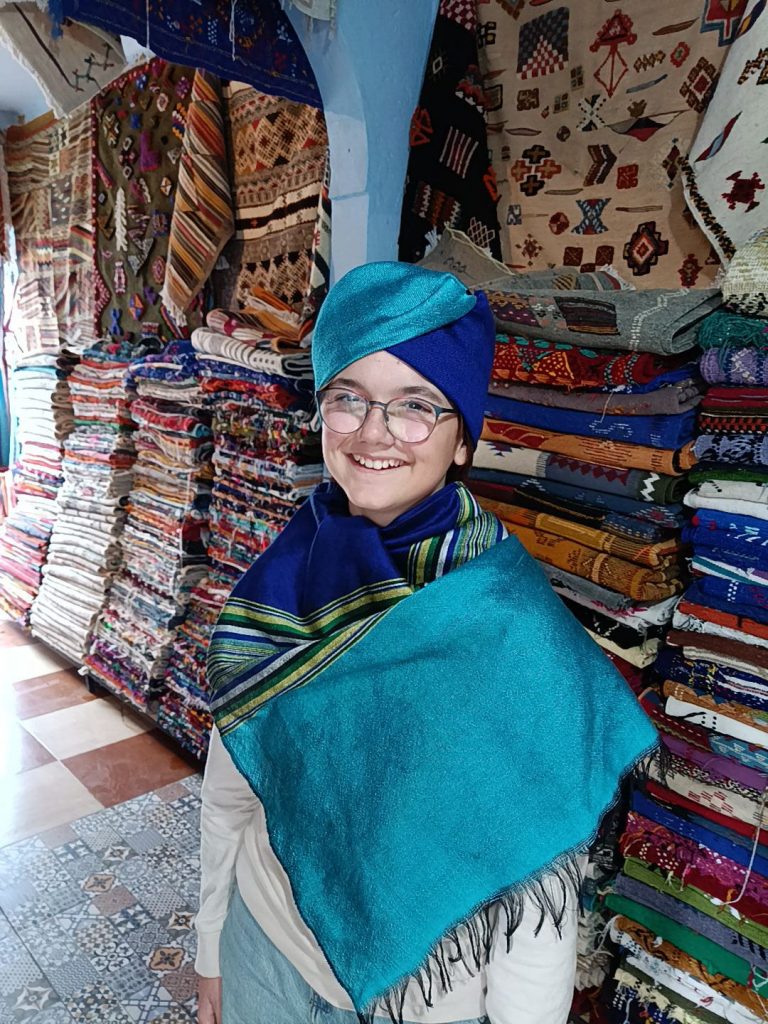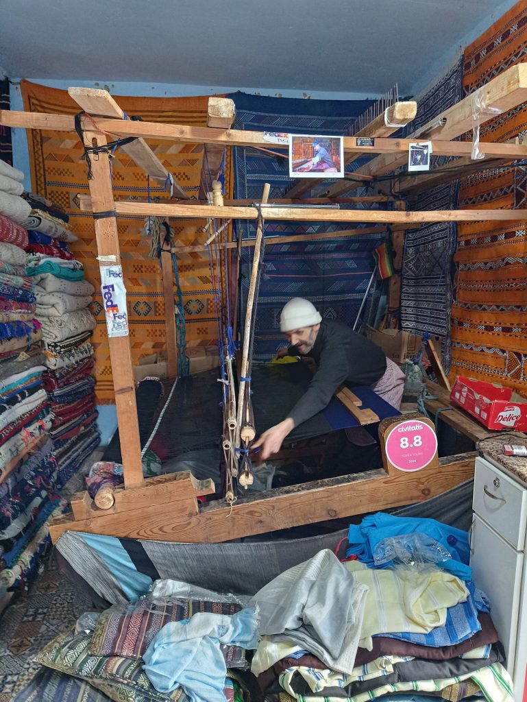 In der blauen Stadt angekommen, war es nicht ganz so einfach einen Parkplatz zu finden. Irgendwo am Straßenrand klappte es dann doch. Rico blieb mit Orle im Charly, während Lucy und ich Chefchaouen erkundeten. Die Medina, die Altstadt, bestand aus sehr engen Gassen mit steilen Wegen, natürlich in der charakteristischen blauen Farbe, die wir aufgrund der Bezeichnung der Stadt erwarteten. Links und rechts reihten sich Geschäfte aneinander. Wir wurden in einen kleinen Laden gewunken, welcher mit einem riesigen Webstuhl ausgestattet war. Der zahnlose, nette Marokkaner zeigte uns sein Handwerk. Spannend, wie geschickt und schnell er das Schiffchen durch die Fäden zog. Wir begutachteten die handgemachten Schals und Teppiche. Der Verkäufer präsentierte uns diverse Stoffe und schlang Lucy einen mit geschickten Handbewegungen um den Kopf. Auch wenn’s wirklich toll aussah und wir beeindruckt von der Arbeit waren, lehnten wir einen Kauf freundlich ab und zogen weiter.