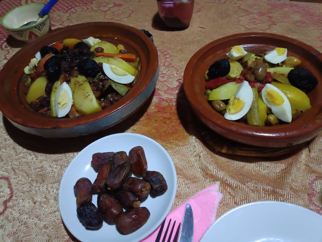 Viele von euch haben uns später direkt kontaktiert, weil sie wissen wollten, wie Kamelfleisch eigentlich schmeckt. Die Antwort: Lecker! 😉 Der Geschmack erinnerte stark an Rindfleisch. Unsere Tajine war gefüllt mit Kamel, Kartoffeln, Porree, Möhren, Zucchini – und Rosinen! Anfangs waren wir etwas irritiert, doch nach dem ersten Bissen waren wir vollends begeistert. Lucys vegetarische Tajine hatte zusätzlich Bohnen und Erbsen, ebenfalls mit Rosinen verfeinert. Alles harmonierte perfekt mit den typischen marokkanischen Gewürzen. 🍠🥕