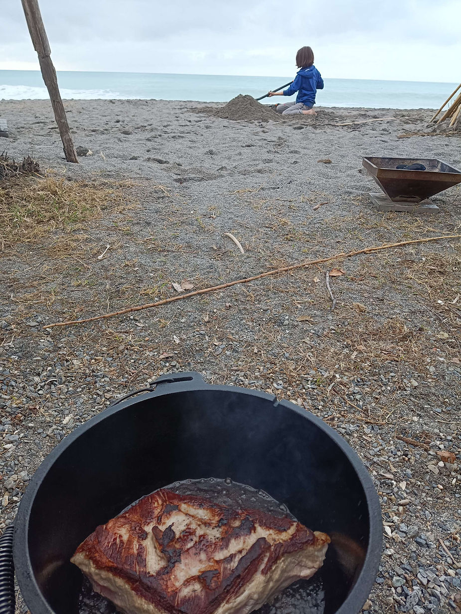 Rico brät im Dutch-Oven unseren Festtagsbraten für morgen.