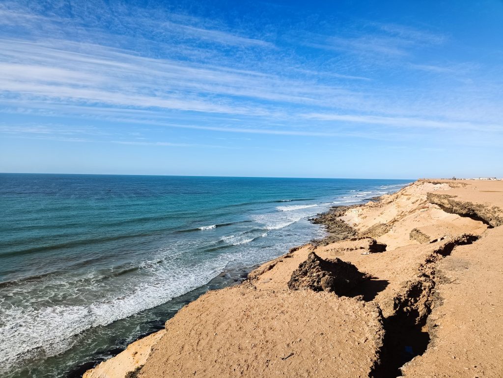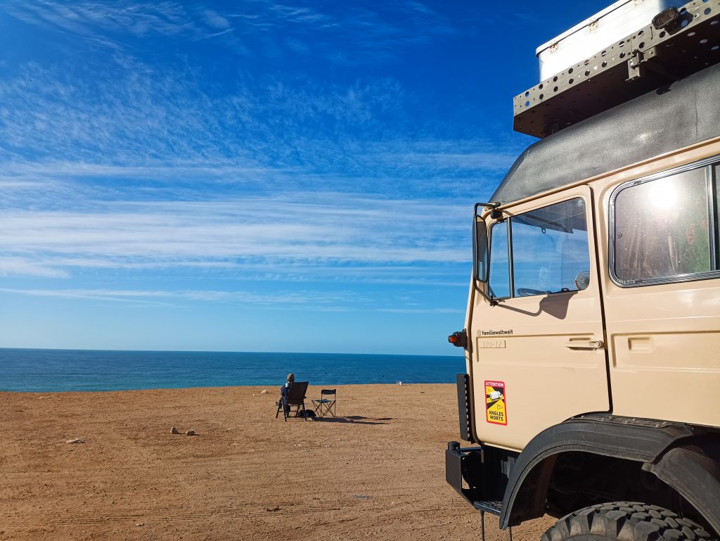 Unsere erste Nacht in der Westsahara verbrachten wir auf einem großen Parkplatz einer kleinen Stadt, direkt am Meer. Die Wellen rauschten, der Wind rüttelte an Charly, und nur wenige Meter entfernt hielt ein Militärposten Wache – 24 Stunden lang. Ob sie tatsächlich aufpassten oder nur körperlich anwesend waren – wer weiß 😉 Aber allein ihre Präsenz gab uns ein sicheres Gefühl.