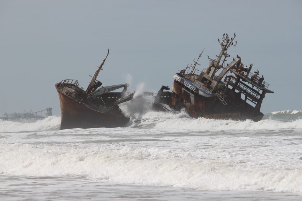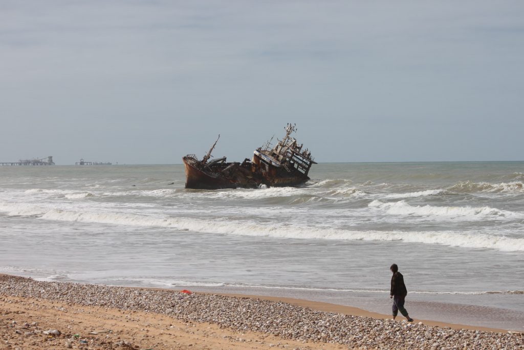 Die endlose, eintönige Landschaft zog an uns vorbei, und die Fahrt war ehrlich gesagt ziemlich langweilig – bis wir plötzlich ein altes Schiffswrack entdeckten. 🏴☠️ Ein Anblick wie aus einem Apokalypsefilm! 🎬 Wir suchten einen geeigneten Stellplatz, dann schnappten Rico und ich uns die Kamera 📸 und liefen an den Klippen entlang, während Lucy im Charly blieb – sie hatte mal wieder keine Lust. 😅