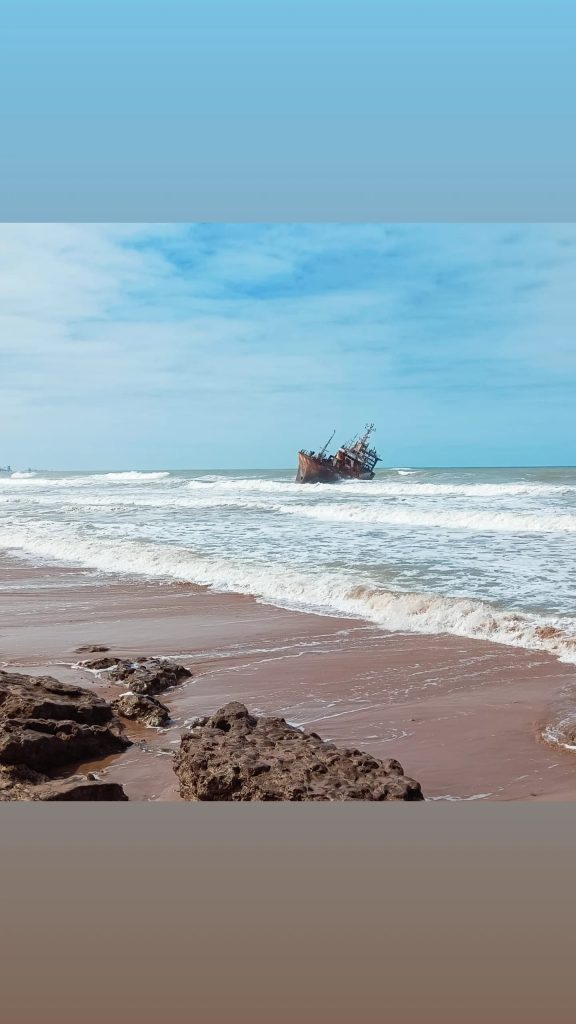 Das Wrack war beeindruckend: vom Salzwasser gezeichnet, rostig, halb versunken und dennoch voller Geschichte. ⚓ Besonders Ricos Foto hat die Atmosphäre perfekt eingefangen – ein fast menschenleerer Strand, nur eine einzelne Gestalt (ich) in der Ferne und das gestrandete Schiff als stummer Zeuge vergangener Zeiten.